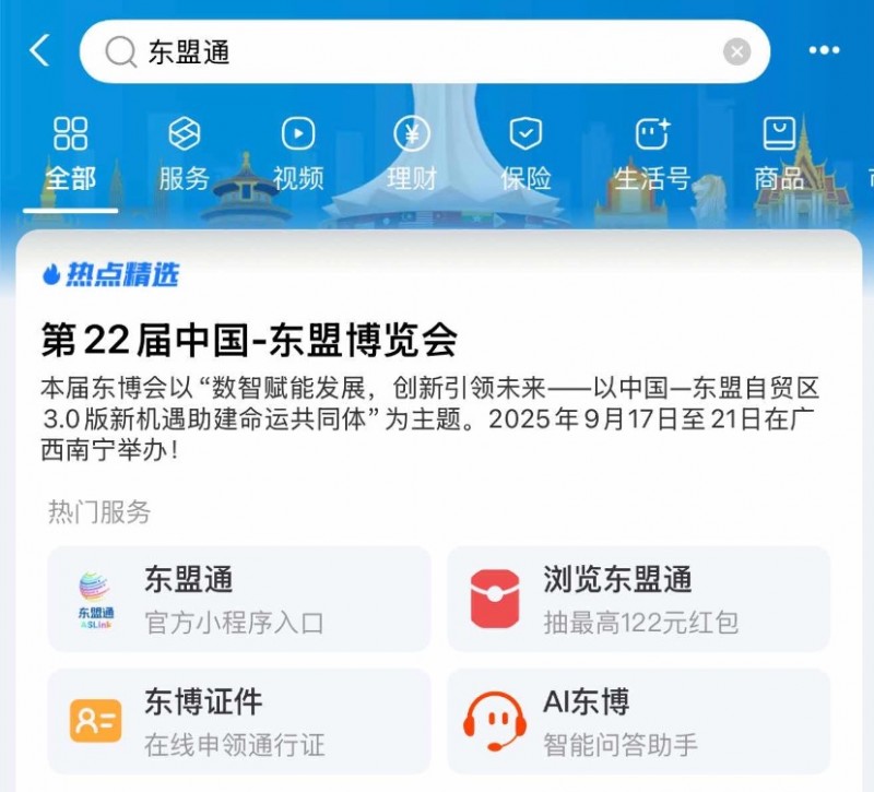 “东盟通”小程序作为大会唯一官方小程序上线支付宝。参展商和嘉宾可在小程序上申领东博会证件,无论是来广西还是前往东盟国家,也都可一站式办理出入境、离境退税、跨境付款等事务,享受覆盖出行、住宿、游玩等场景的多元化服务。通过“东盟通”小程序,还可直达线上会场,了解大会动态、经贸活动和展览内容。
